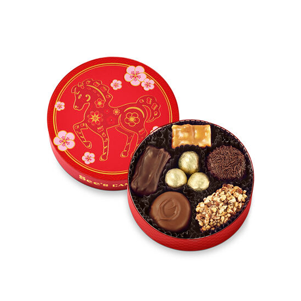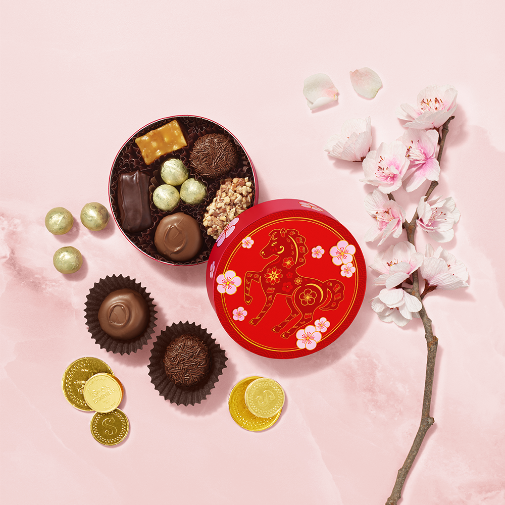 Celebrate the Year of the Horse with this charming gift box, packed with chocolates and nutty treats. Adorned with a festive horse in shimmering gold foil, it’s a wonderful way to share good fortune and sweet wishes this Lunar New Year.